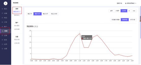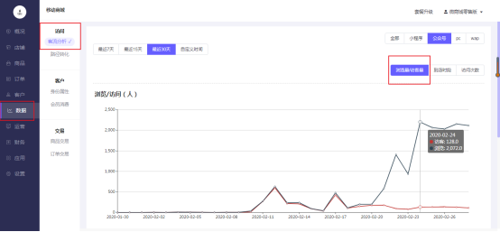点击不同的渠道卡片【全部】【小程序】【公众号】【pc】【wap】,下方的【浏览量/访客量】【到店时段】【访问次数】【访问来源】则展示所选渠道的数据。