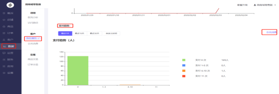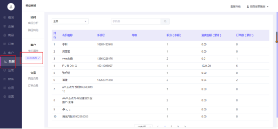 可自定义时间段查看用户下单支付的增长,点击旁边的“会员消费”可调转至“数据-客户-会员消费”里查看平台内的所有会员消费详情。