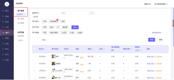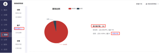 分析平台会员和非会员身份的占比情况及累计客户数,点击“查看详情”可跳转到“客户-客户管理-全部客户”页面,查看平台内所有用户的信息。
