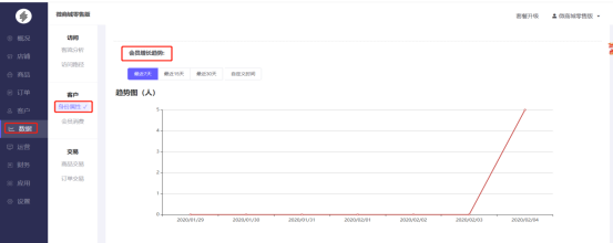 可自定义时间段查看会员的增长,方便商户根据会员增长的时间情况设置店铺活动。