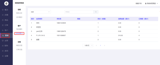 可查询平台内全部会员的消费情况,也可在搜索栏里按订单数,消费金额,会员手机号,进行搜索。