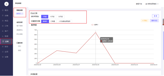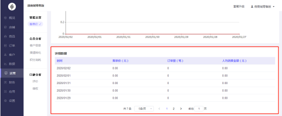 运营数据在每个企业中都有着至关重要的存在,企业的战略部署都是依靠着数据的分析,才能制定出下一步的战略方向。我们以折线图堆叠的形式清晰的看到实时的客单价情况,根据实时数据可以了解到我们当下的经营状况。也可以按时间筛选,关键指标详解,多个维度为商户做数据分析,为运营活动做数据支撑,同时我们支持数据一键导出到本地电脑上。