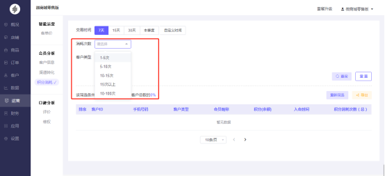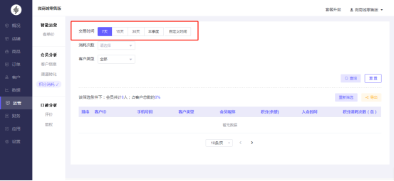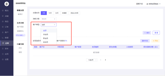 1.积分消耗情况可通过交易时间、消耗次数、客户类型三个维度进行查询该筛选条件下:会员共计人数;占客户总数%.