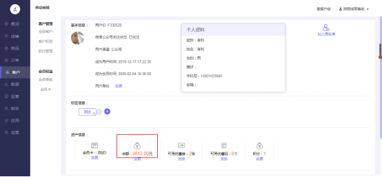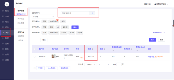 您可以通过客户-客户管理-全部客户-搜索对应的手机号或昵称,快速查看到储值余额,点击客户详情可以看到资产信息