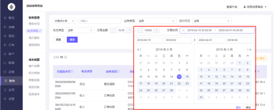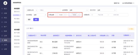5.交易金额,交易金额可根据自定义金额区间值进行筛选。