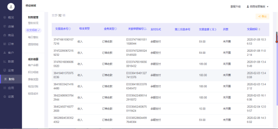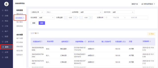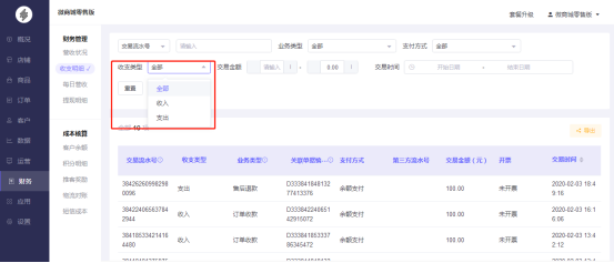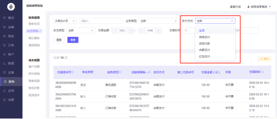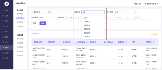 2.可通过订单收款、售后退款、退还奖励、提现成功、红包发放进行筛选。