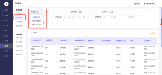 1.可通过交易流水号、关联单据编号、第三方流水号进行筛选。