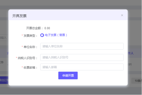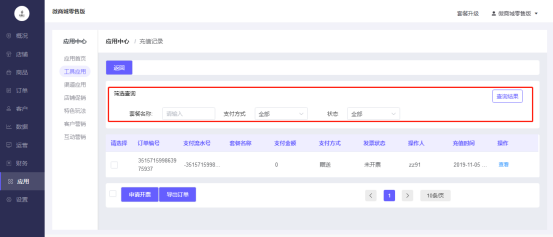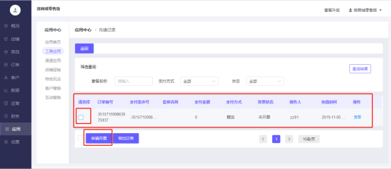 如有开发票需求,点击申请开票,筛选查询到需要开票的订单,点击申请开票或者导出订单: