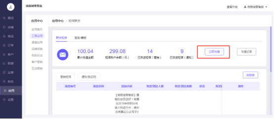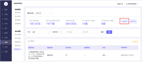 如当前短信余额不足,您可以点击充值记录,跳转到应用-应用中心-工具应用-短信群发-立即充值 ,选择套餐充值即可。