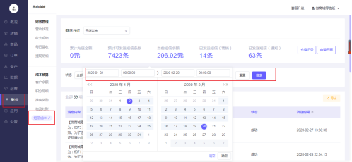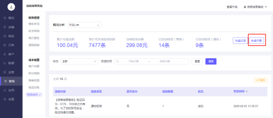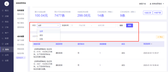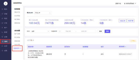 在移动商城我们添加了短信模块,短信模块共分为两种,一种为营销型短信,一种为通知型短信。其目的主要是帮助商家增加与客户之间的粘性,使复购率得到提升。在财务板块中,商家可以看到所有剩余短信的明细比如从开始到目前截止时,累计充值金额、预计可发送短信条数、当前短信余额等。