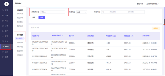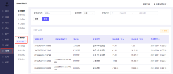 我们可以通过交易流水号、交易类型、交易时间获取到客户的变动金额明细、剩余金额明细,客户将余额提现到自己账户或在商城内直接进行消费。客户余额一部分指的是红包到账、商家手动调整、会员升级奖励、会员卡升级奖励的获得的余额情况;另一部分则指客户订单付款、售后退款、申请提现、提现失败的余额情况