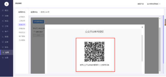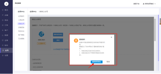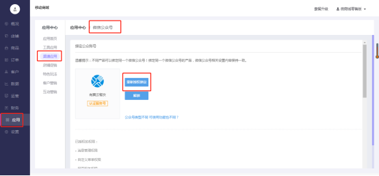 操作路径:移动商城电脑端后台-应用-应用中心-渠道应用-微信公众号-重新授权