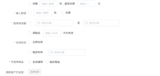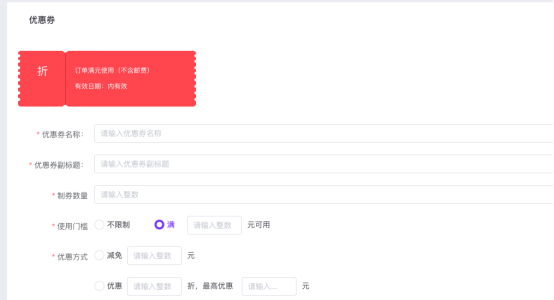 您可以选择满减、折扣两种类型的优惠券,进行定向营销。