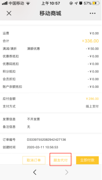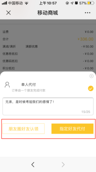 买家下单时点击“支付”,选择“朋友代付”,可以分享到朋友圈,也可以指定好友代付: