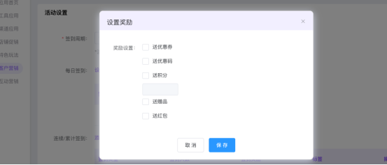 设置奖励:即客户每天签到可以赠送优惠劵,优惠码,积分,赠品,红包