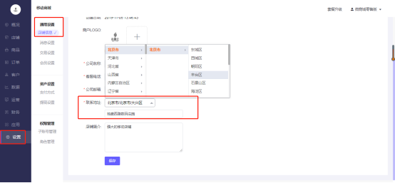 1.商家可通过移动商城电脑端后台 - 设置 – 通用设置-店铺信息 –基本信息,去设置\修改联系地址。