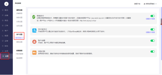 移动商城电脑端后台-资产设置-支付方式,开启对应的支付方式