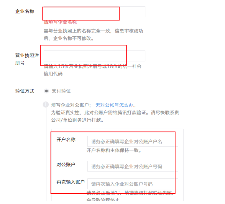 4、在界面中,输入公众号主题的公司名称、营业执照号、支付验证(输入自己公帐信息,后面需要打款验证)。