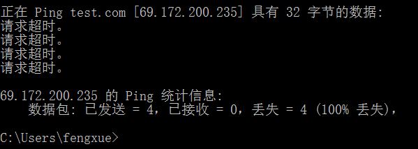 如果您ping域名时出现 timeout的超时丢包现象。如图: